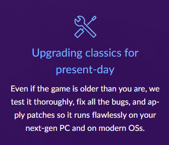 현재에 맞게 클레식 게임들을 업그레이드합니다. 심지어 당신보다 오래된 게임도 철저히 테스트하여 버그를 수정하고 패치를 적용하여 차세대 PC와 현재 OS에서 완벽하게 실행되도록 합니다.