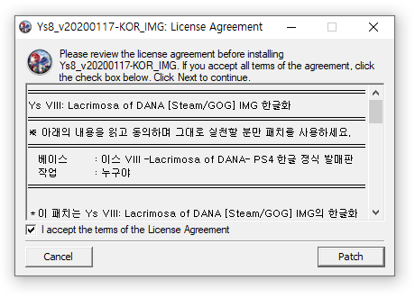 이스 8 라크리모사 오브 다나(Ys VIII, Lacrimosa of DANA) 한글패치입니다.
